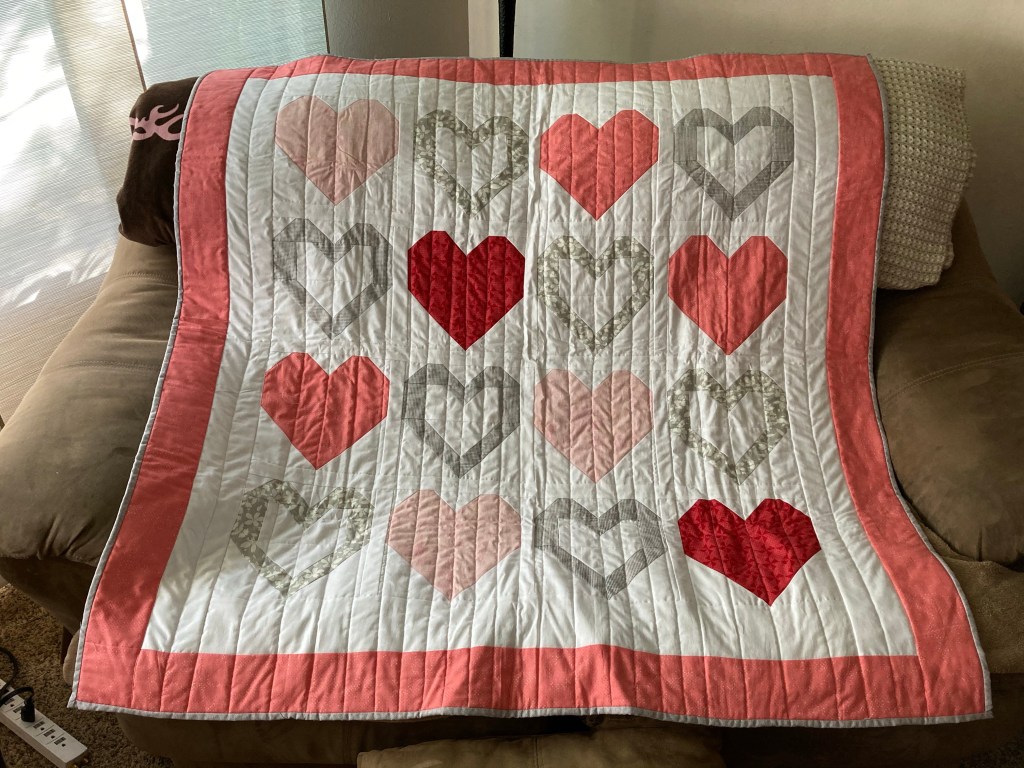 So with all that has happened I only made a Peanut Butter Pie to celebrate a day off and finished the heart quilt with straight line quilting. Miss having Jeanette around the corner…