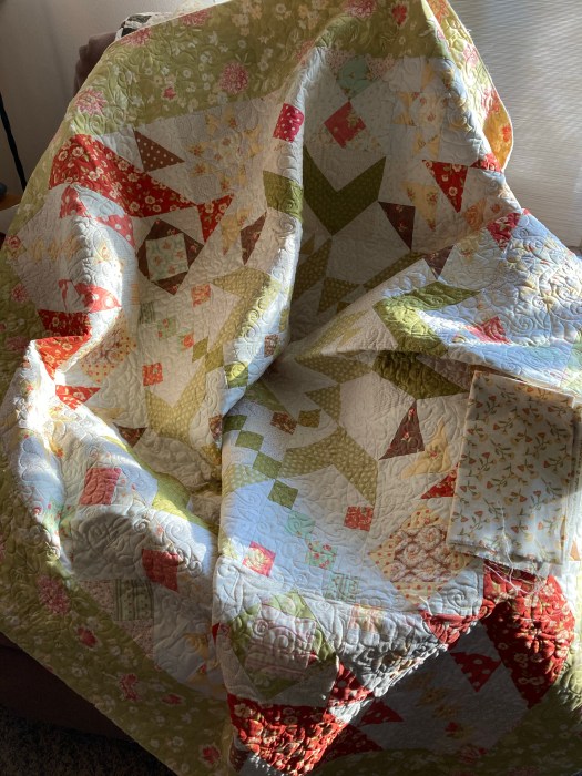 Love how it turned out. Jeanette did a kind of orange peel quilting motif that reflected one of the fabrics. I think it will be a Christmas gift…