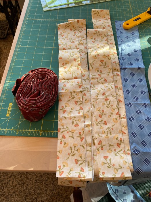 I have the binding strips cut out, so as long as it doesn’t get lost in the mail, I should be able to have it done by the wedding. I need to get caught up on bindings so have top stitched two other quilts. My goal for this month is to get at least one of them completed. Really, how long should a binding take? This is the one I will tackle first!