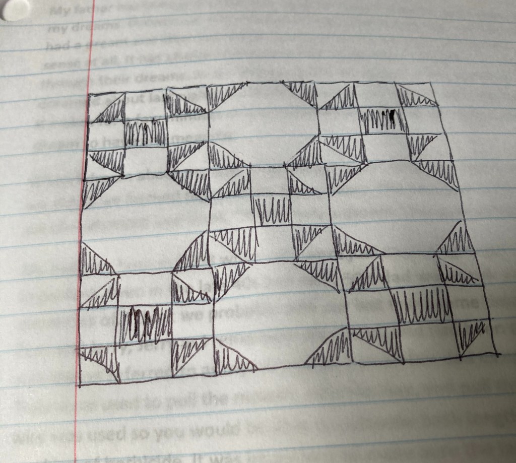 Years ago on a blog, the author made a two block quilt she called Snow Shoo, using a snowball block and the shoo fly block. I thought it was such a unique look. I emailed myself a link to her blog and I can not find it anywhere. It was so many years ago I think I would have a quilt done by the time I found the link. So I tried to draw out what I remember.