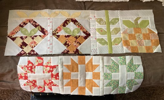 In the last months packet, they included an eggplant purple for an inner border and than a coral/orange floral for the outer border that just wasn’t my style. As is, it measures 63 1/2 by 75. On Facebook, I saw pictures of last years sampler BOM that did not include a border and I really liked it. Also, this isn’t the type of quilt I will put on a bed. Will look great on the quilt rack or a hanger for show so it really doesn’t need to be any larger. My quilter assured me that all those seams on the edge won’t matter so I am happy with my decision. Here are a few pictures of some of the sections as I put it together.