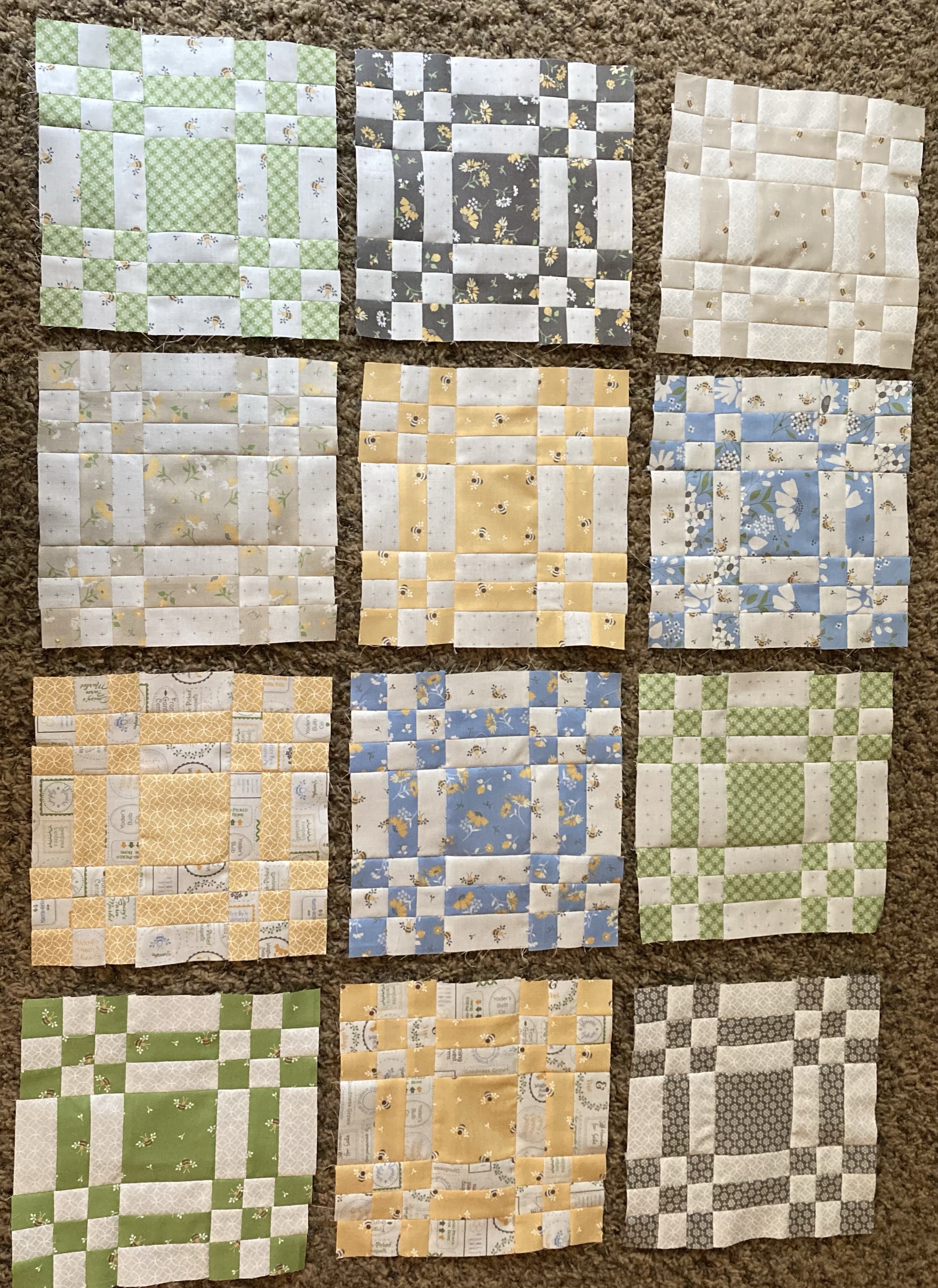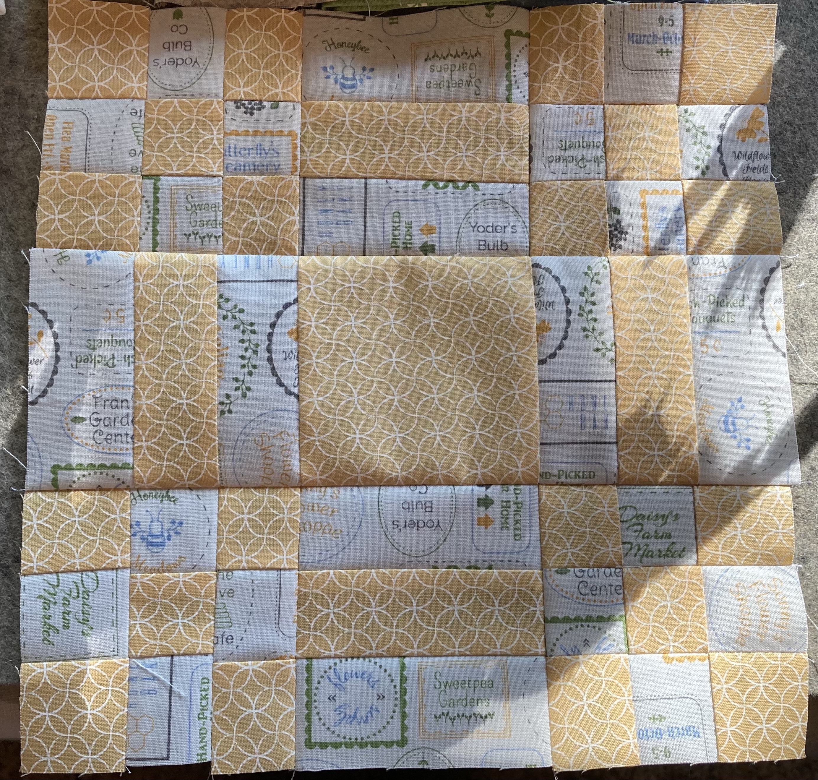I have completed one quilt top. The fabric is Spring Brook from Corey Yoder. The colors just feel like spring and are so cheerful. I love yellow, and these are the perfect shades of blue and green. The pattern is from the magazine American Patchwork and Quilting. I didn’t have it with me when I purchased the fabric – I used primarily fat quarters and a charm pack. When I went back for the border fabric, the only floral left was the stone background. Not my first choice but I am happy with the final quilt top.