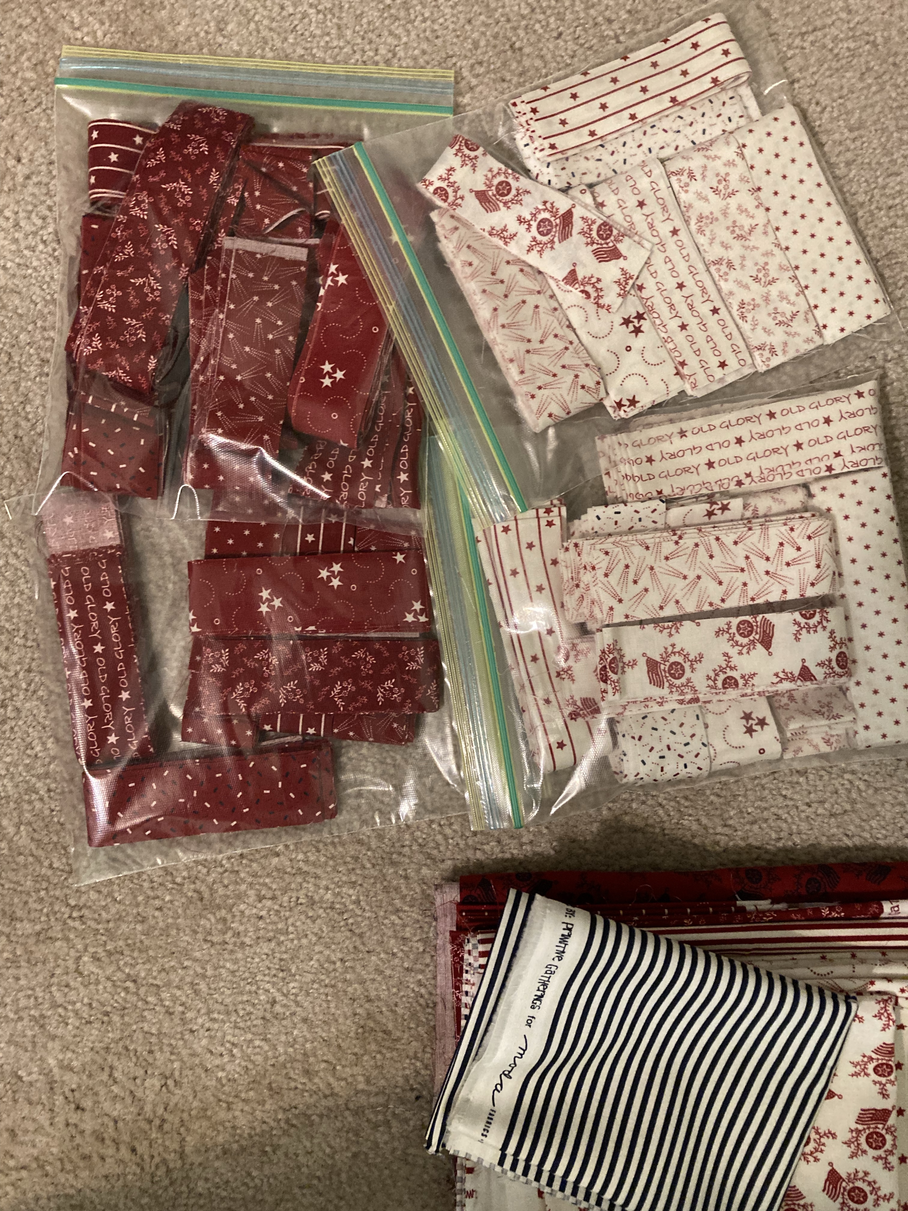 While at Denny’s for Christmas break, I started cutting out my next quilting project. From Primitive Gatherings, a patriotic sampler quilt.