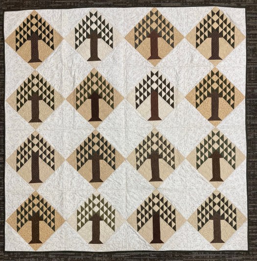 This quilt is for my cousins, Gary & Joni. One Thanksgiving holiday, I had brought a few quilts along to show my aunt. Joni and Gary were home and Joni later asked if I would make them a quilt. Well three to four years later it is finished, except for a label. I mainly used Kansas Troubles fabrics for the trees and background. I believe the setting squares is a Kim Diehl fabric. That was part of the delay, it took a long time to find a shade that blended with all the other background fabrics. I really love how it turned out and hope Joni does too! Once again, Jeanette of JanieCreates.com, did the fantastic quilting. If you are near Eagan, Minnesota, or willing to mail your quilt tops, I highly recommend her!