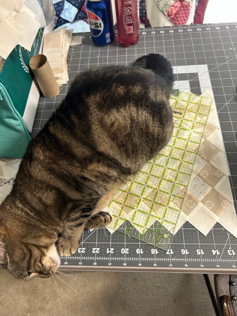 The friend I am staying with has cats – not always helpful, but they are cute. I am happy with the results. Jeanette did a great job of quilting, I just need to add a label and finish the binding.