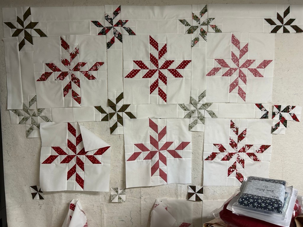 The last completed top is for the youth group back in Abilene. Carol asked if I would be willing to make another quilt for a fundraiser around Thanksgiving. I just realized it is also from The Pattern Basket. She does design lovely quilts! I chose a winter/Christmas theme and went with Peppermint Twist. Easy block, great directions, lattice a little more complicated, but still easy if you are organized.
