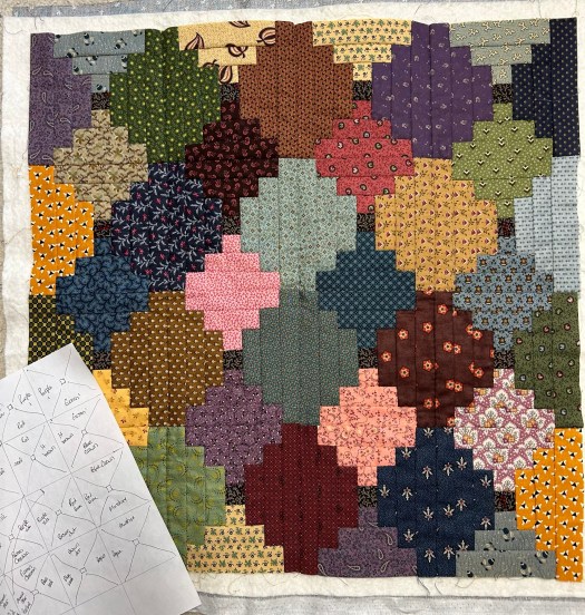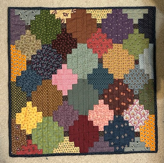 I also like doing this to try new blocks. I have done log cabin blocks before, but not courthouse steps blocks. I quilted in the ditch around the shapes and down the middle of the larger shapes. I love the color mix! Some of the fabrics I have had for a long time, and some are from current fabric lines. I used a black square in the center of each block and a black backing and binding. It now resides in California! Before starting, I drew a diagram to keep like colors apart, but missed marking edges, and soon didn’t keep to it as marked.