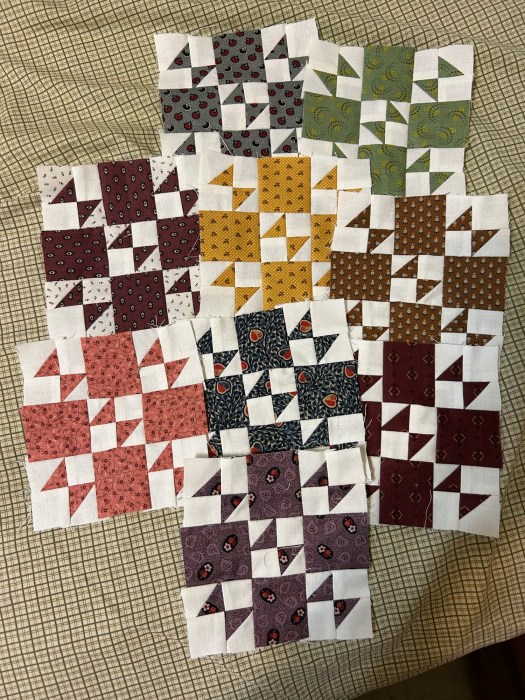 This was fun to do and I look forward to working with this block again! I have also been making Fancy Four Patch blocks! This is a sew along sponsored by Taryn, of Repro Quilt Lover. They are tiny blocks. 1 1/4″ blocks. I started behind because that size makes me a little anxious so I ordered half-square triangle paper. But it was the wrong size so I just jumped in once the doll quilt was done. Still haven’t caught up, but I have enjoyed the process and the blocks that I have made so far. It is not a race.